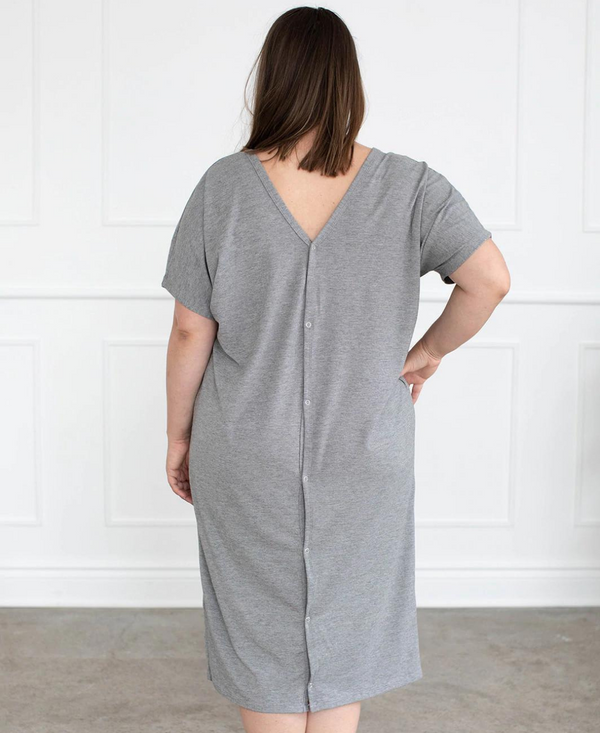 Meet Sonday's Labour and Delivery Gown, a hospital gowns with snaps all down the back, including three in the front.